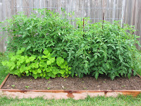 I also received a gift of a grafted indeterminate tomato plant from one of the market vendors. It's too late in the season for it to produce this summer, but it should be a big producer this coming fall. There wasn't any room in the beds, so we just potted and staked it in the middle of the yard. Always room for more :)